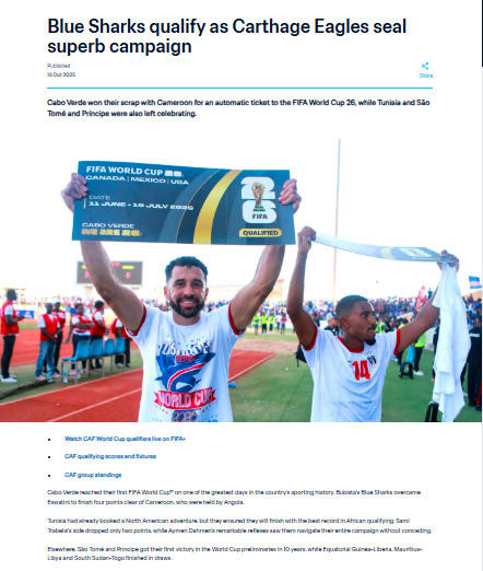 与此前从亚洲区预选赛出线的约旦队和乌兹别克斯坦队一起,佛得角队将在明年首次亮相世界杯决赛圈。国际足联官网在文章中直言,这样的历史是在世界杯决赛圈从32强“扩军”至48强的背景下完成的,这一变化让更多球队开始憧憬并最终登上这一全球最受关注赛事的舞台之上。